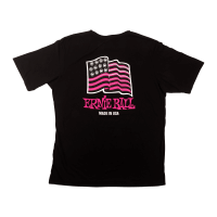 Ernie Ball USA Ball End Flag screen printed on the back of a black polyester/cotton shirt with Ernie Ball logo on the chest. Experience the soft velvet feel and the unique brushed finish of this incredible fabric. 65% polyester, 35% combed ring-spun cotton, 3.5oz fabric.